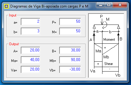 Programa free que mostra os diagramas de momentos fletores e forças cortantes de uma viga bi-apoiada com carga momento e carga concentrada