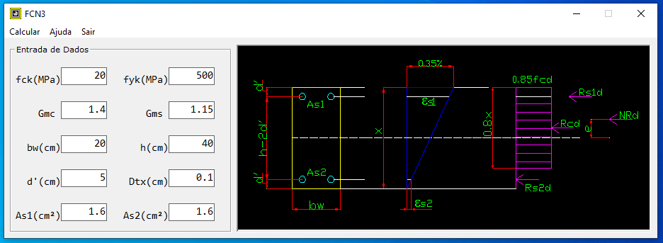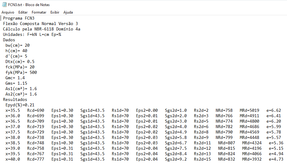 Considerações: O programa gera uma tabela de resultados de deformações específicas, tensões, resultantes, NRd e MRd para linha neutra x de x=0 até altura últil x=d. Para Domínio 4a da NBR-6118.