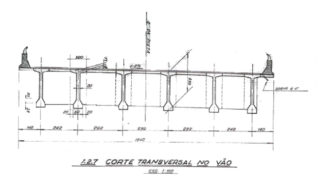 Características: Extensão 40m, largura 8m, caixões prefabricados de 20m apoiados em pórticos